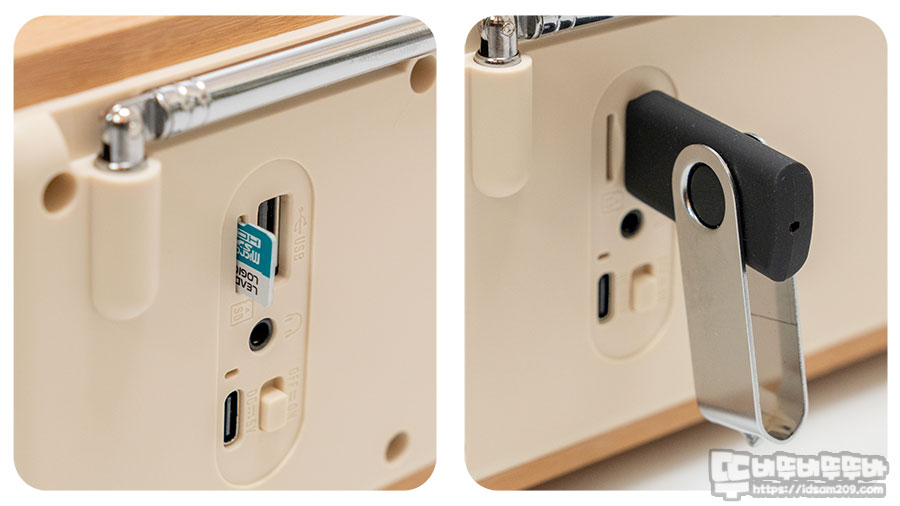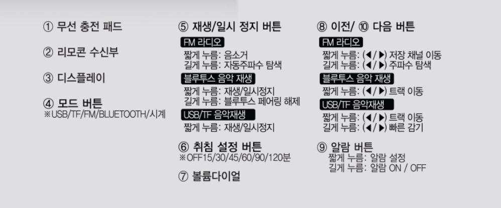 제품 뒷면에 전원버튼 On을 선택 후 전면에 MODE 버튼을 눌러 시계 - USB 메모리 - MicroSD 메모리 - FM라디오 - 블루투스 모드로 선택하여 음원 소스를 선택하여 사용하게 되는데요.