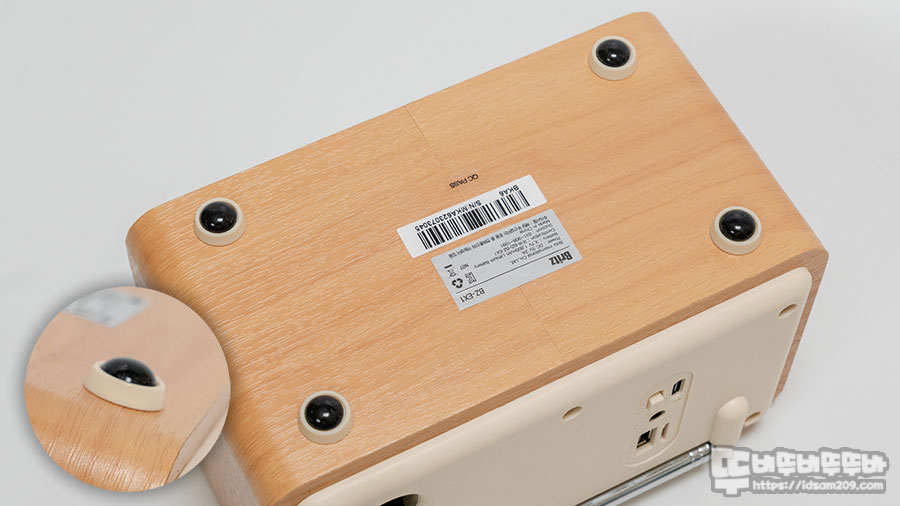 한쪽 측면에는 제품의 특징인 블루투스 5.3 버전 탑재, FM 라디오, MicroSD/USB 메모리를 이용한 MP3 플레이, 무선 충전 지원, 시계/알람 지원, 헤드폰 출력, 66mm 드라이버 유닛, 무선 충전부 패브릭 디자인, 우드 스타일 인클루저 사용 등의 특징과 제품 뒷면에 I/O 포트 설명을 확인할 수 있고요.