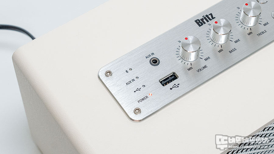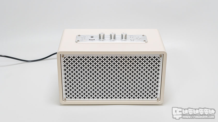 220V 전원을 이용하는 제품이라 그런지 스피커 상단에 컨트롤 부가 위치하고 있으며 볼륨/베이스/고음을 간편하게 조절할 수 있는 볼륨 다이얼을 중심으로 오른쪽에는 입력 소스를 선택하는 버튼과 전원 및 재생, 트랙 이동 버튼 그리고 왼쪽에는 AUX 입력과 USB 단자 그리고 소스 선택을 빠르게 확인할 수 있는 LED 인디케이터로 구성되어 있습니다.