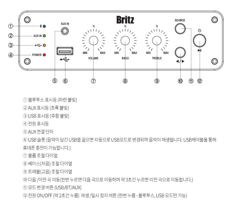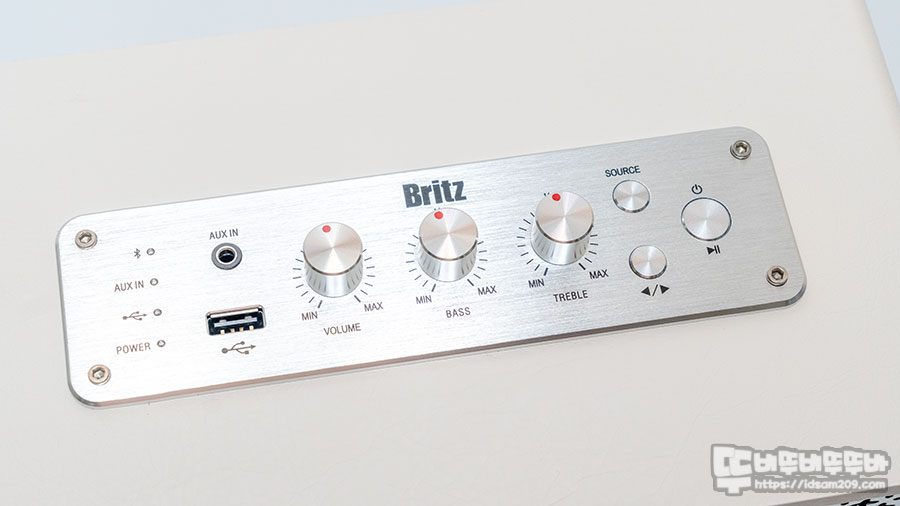 컨트롤 부를 살펴보면 가운데 볼륨/베이스/고음 조절 다이얼을 중심으로 오른쪽에 전원 버튼 겸 재생/일시 정지 버튼, 소스 선택 버튼, 트랙 이동 버튼 그리고 왼쪽에 AUX 및 USB 입력 단자와 LED 인디케이터로 구성되어 있고요.
