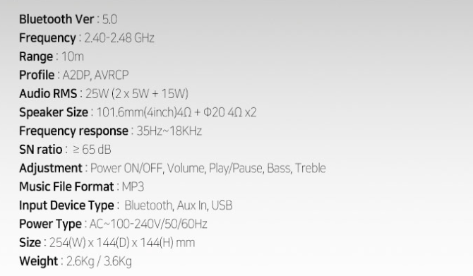 포인트 정보로는 블루투스 5.0 버전, USB 메모리 및 AUX Input 지원, USB 충전 지원 그리고 정격출력 25W 등의 정보가 인쇄되어 있고요.