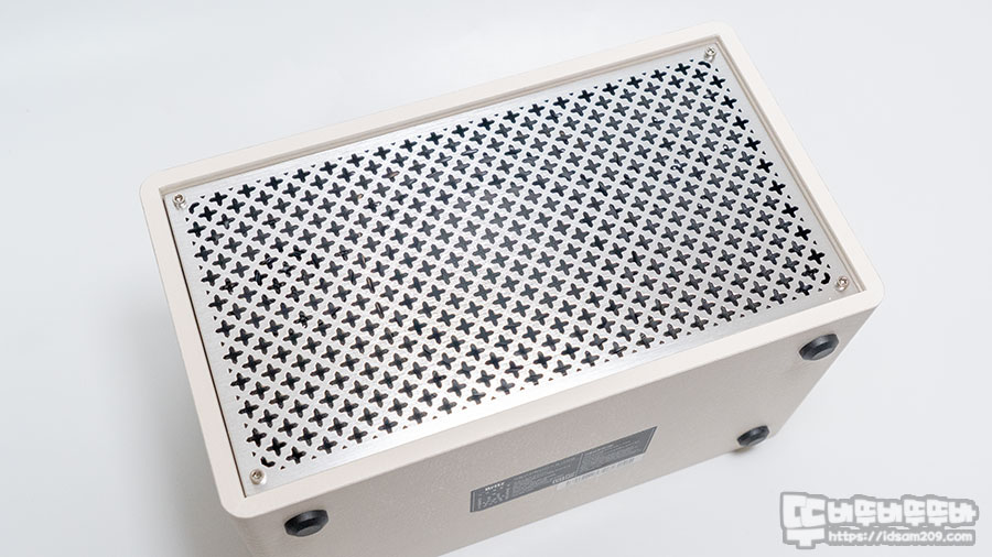 MDF 인클로저에 화이트 느낌의 인조가죽이 랩핑된 밝은 톤이라 그런지 전면에 메탈 그릴이 잘 어울리는 느낌입니다.