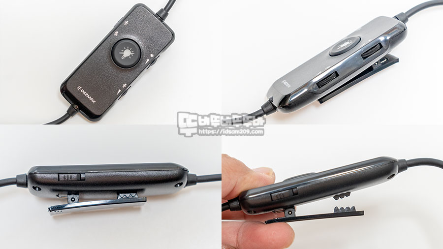유선 제품답게 케이블 중간에 부착된 컨트롤러는 생각보다 큰 편이지만 옷에 고정하는 크립이 일체형으로 디자인되어 사용하기에 좋은 편이며 마이크 On/Off, LED 라이팅 On/Off, 마이크 및 사운드를 볼륨 다이얼을 통해 직관적으로 조절할 수 있습니다.