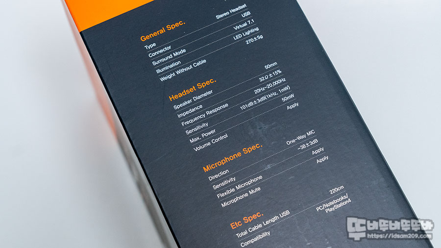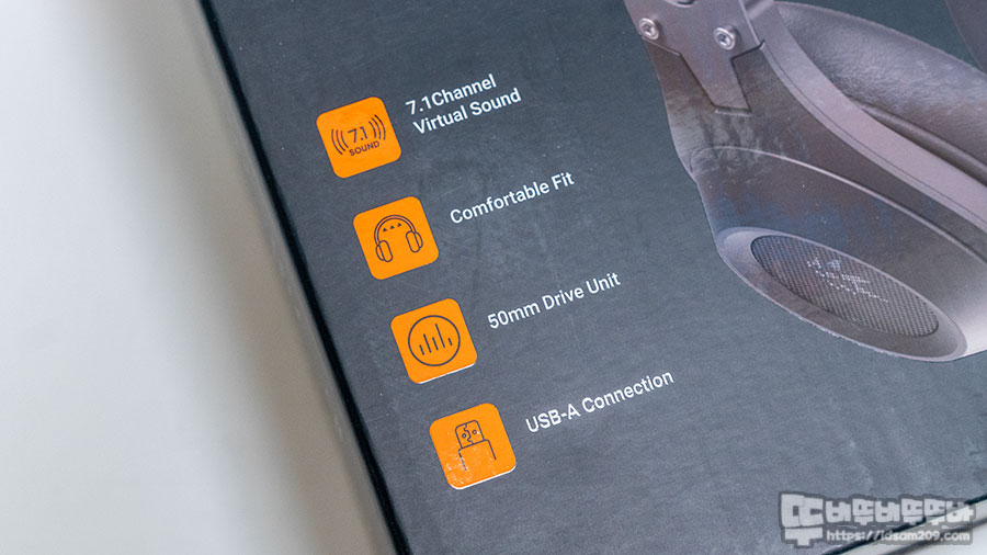 패키지에는 제품의 이미지와 특징인 가상 7.1채널, 50mm 드라이버 유닛 사용, USB 방식임을 표현하고 있네요.