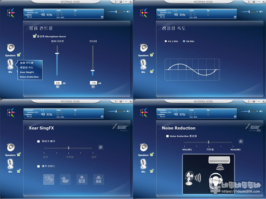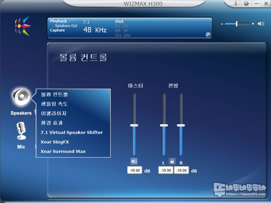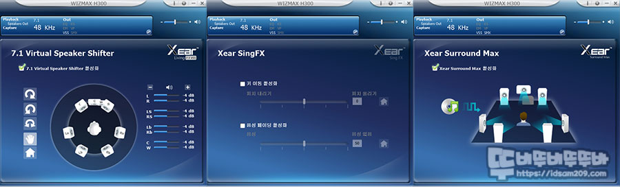 소프트웨어는 C-Media 레퍼런스 디자인의 모습으로 CM108B 칩셋을 사용된 걸로 추측되며 가상 7.1 채널을 사용하기 위해서는 7.1 Virtual Speaker Shifter 활성화 Xear Surround Max를 활성화하여 같이 사용하는 것을 추천드립니다.