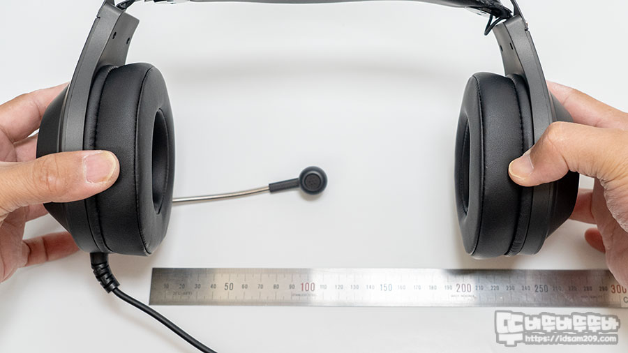 인조가죽 소개의 이어패드를 11자 형태로 유지하면서 좌우로 늘려보면 약 200mm까지 늘어나는 것을 확인할 수 있는데 안경을 착용하는 필자의 경우 안경다리 폭이 155mm 정도로 꽤 여유 있게 착용이 가능하더군요.