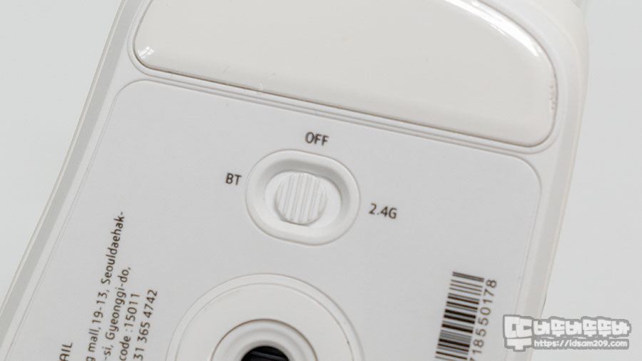 바닥면에 유일하게 조작하는 스위치는 BT / RF 2.4 GHz 무선과 Off로 설정 시 충전 겸 유선으로 사용할 수 있어 상황에 맞게 사용하시면 좋습니다.