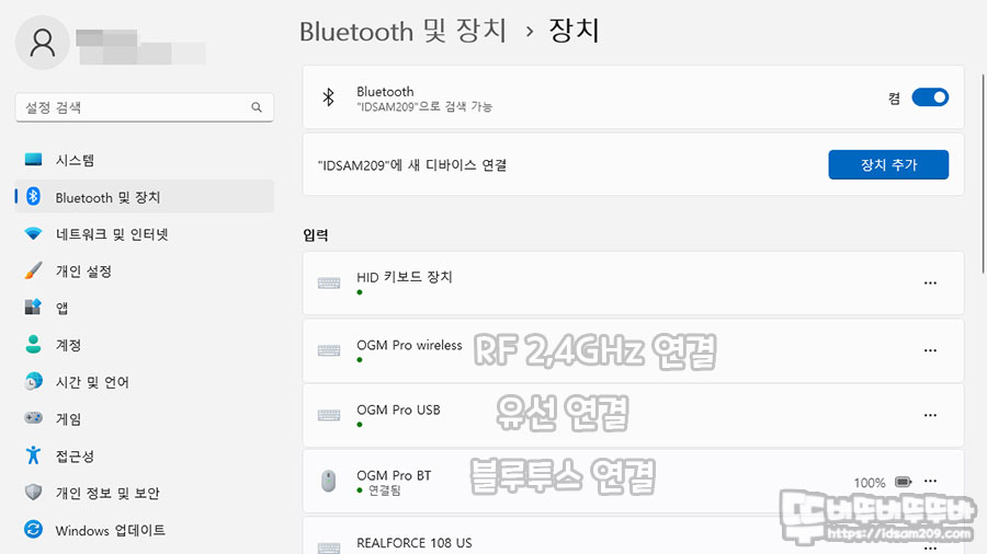 RF무선, 유선, 블루투스 3가지 연결을 지원하는 모델이기에 각각의 방식으로 연결 시 컴퓨터에서 확인할 수 있는 명칭이 다름을 확인할 수 있고요.