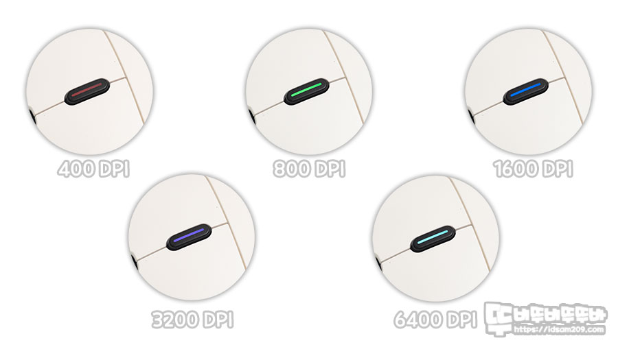DPI 버튼은 충전 시에는 배터리 라벨에 따른 LED 표현 그리고 완충 시 LED Off, 블루투스 모드로 사용 시 Blue LED가 점멸하며 페어링 모드임을 표현하는 등 DPI 컬러 이외 다양하게 표현되니 참고하시기 바랍니다.