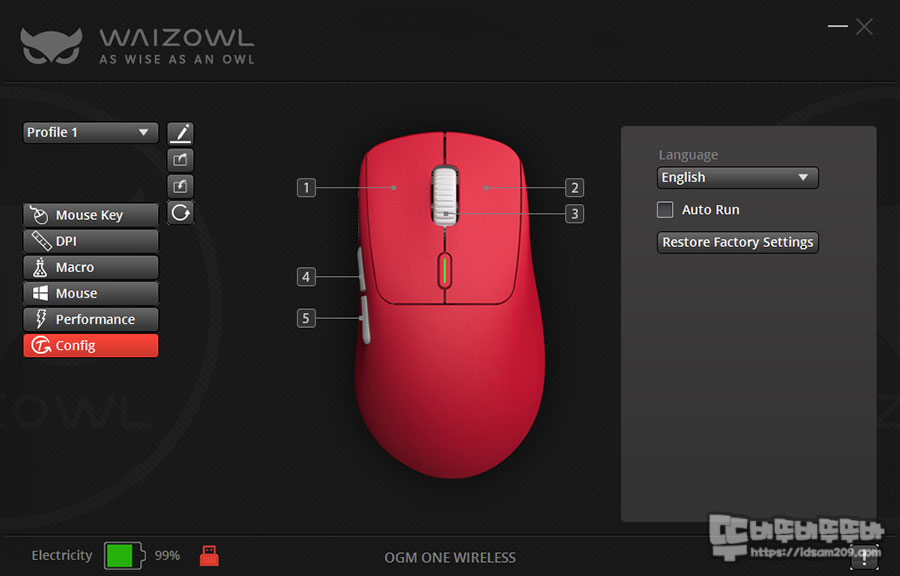 Config 메뉴에서는 프로그램 언어 선택과 팩토리 리셋을 지원하며 프로그램 하단에 마우스 연결방식에 대한 표현과 배터리 잔량을 아이콘으로 표현하고 있어 배터리 상태를 빠르게 확인할 수 있으니 참고하시기 바랍니다.
