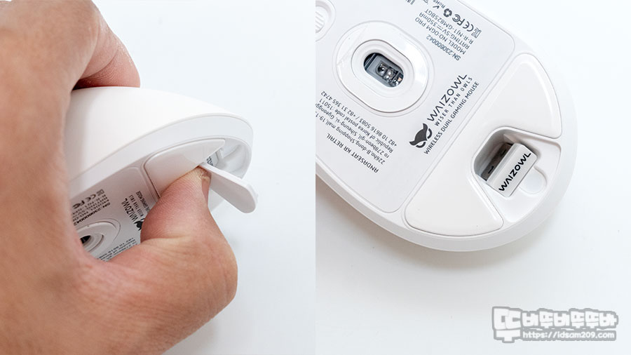 마우스 뒤쪽 부분에는 자석으로 고정되는 커버를 사진과 같이 손으로 눌러주면 마우스 안쪽에 수납된 무선 리시버를 확인할 수 있으니 휴대하거나 별도로 보관할 때 꼭 마우스 안에 리시버를 넣어서 보관하세요.