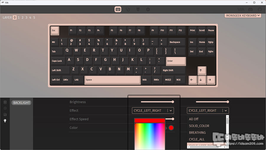 Effect 메뉴를 선택하면 키보드에서 구현 가능한 LED 효과 리스트가 나오는데 기능 선택 후 밝기, 속도, 단일 컬러의 경우 컬러 선택까지 가능합니다.