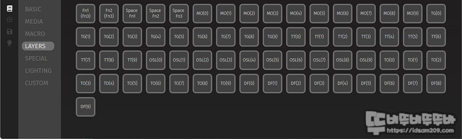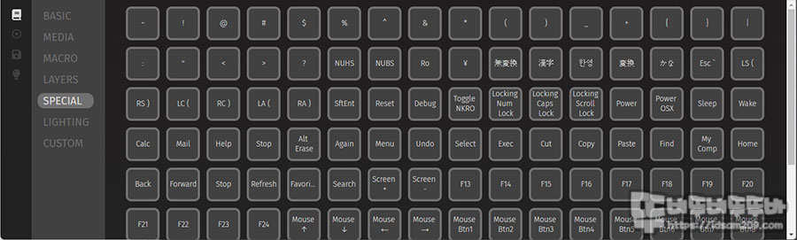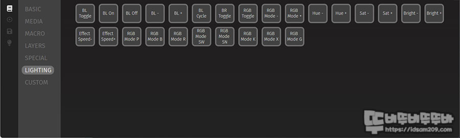 키보드 자판 기능을 부여할 수 있는 KeyMap에는 기본, 미디어, 매크로, 레이어, 스페셜, 라이팅, 커스텀 순으로 각 항목에 해당하는 내용들을 확인할 수 있습니다.