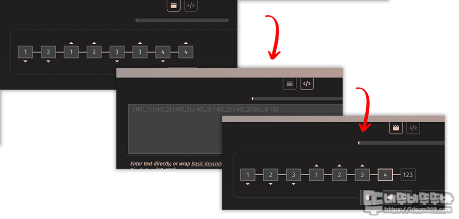 혹시라도 키 프레스 입력과 텍스트 입력을 동시 하는 매크로를 구현하신다면 키 프레스 입력 후 텍스트 모드로 전환하여 텍스트 입력 그리고 저장하시면 위와 같이 2가지 매크로 기능을 구현할 수 있습니다.