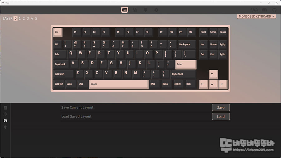 VIA 프로그램을 구동하면 자동으로 MONSGEEK 키보드를 인식하고 연결된 제품의 키배열을 보여줍니다.