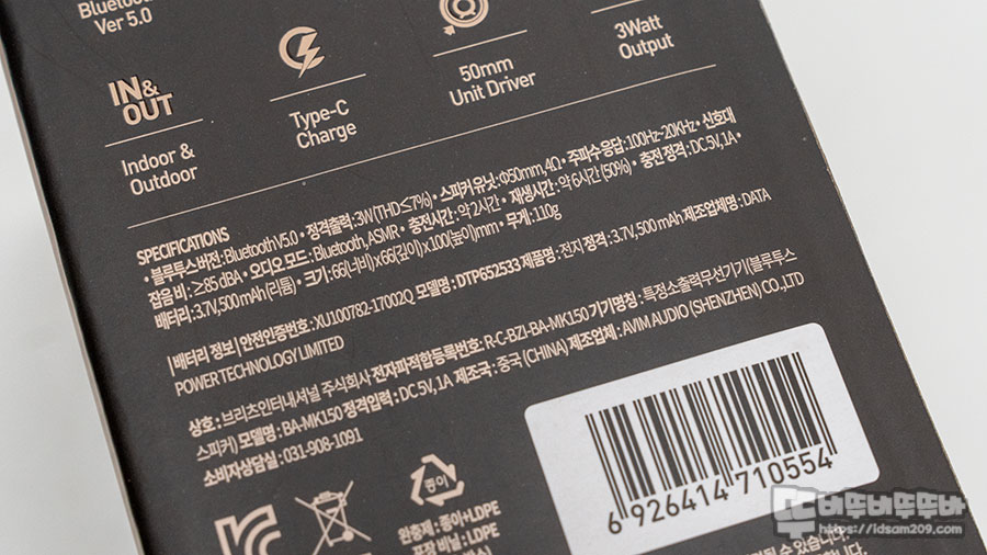 블루투스 5.0 / 출력 3W / 스피커 유닛 50mm / 지원 모드 : 블루투스, ASMR / 내장 배터리 500mAh / 충전 및 사용 시간 : 약 2시간 / 약 6시간 (50% 볼륨) / LED 라이팅 (오토) / 크기 및 무게 : 66 X 66 X 100mm, 110g 등의 정보를 확인할 수 있네요.