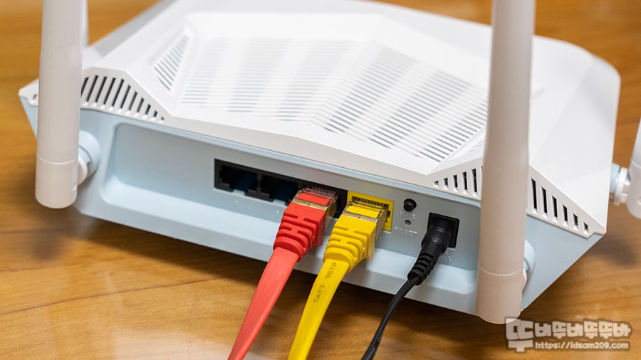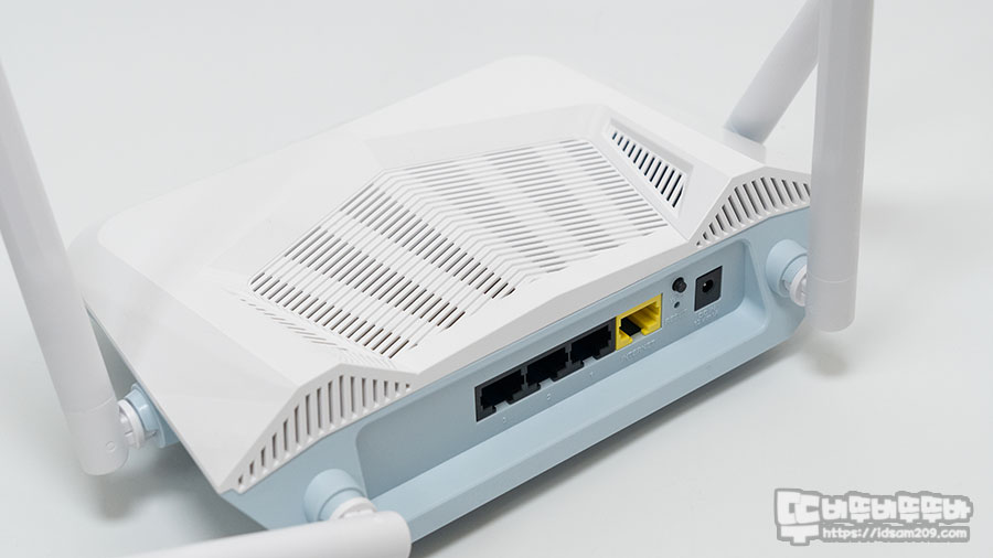 제품 후면 포트 구성은 인터넷 회선을 연결하는 WAN(노란색) 포트 1개와 PC, 셋톱박스, 게임기 등을 유선 연결하는 LAN(검은색) 포트 3개로 모두 기가비트(Gigabit, 1Gbps)를 지원합니다.