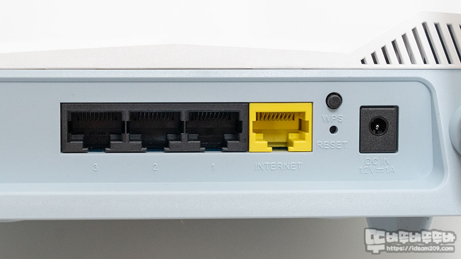 WAN 포트 오른쪽에는 WPS(Wi-Fi Protected Setup, 와이파이 보호 설정) 버튼과 RESET(리셋, 초기화) 버튼 그리고 전원 소켓으로 구겅되어 있어 WPS 연결과 리셋 설정을 간편하게 할 수 있으니 참고하시기 바랍니다.