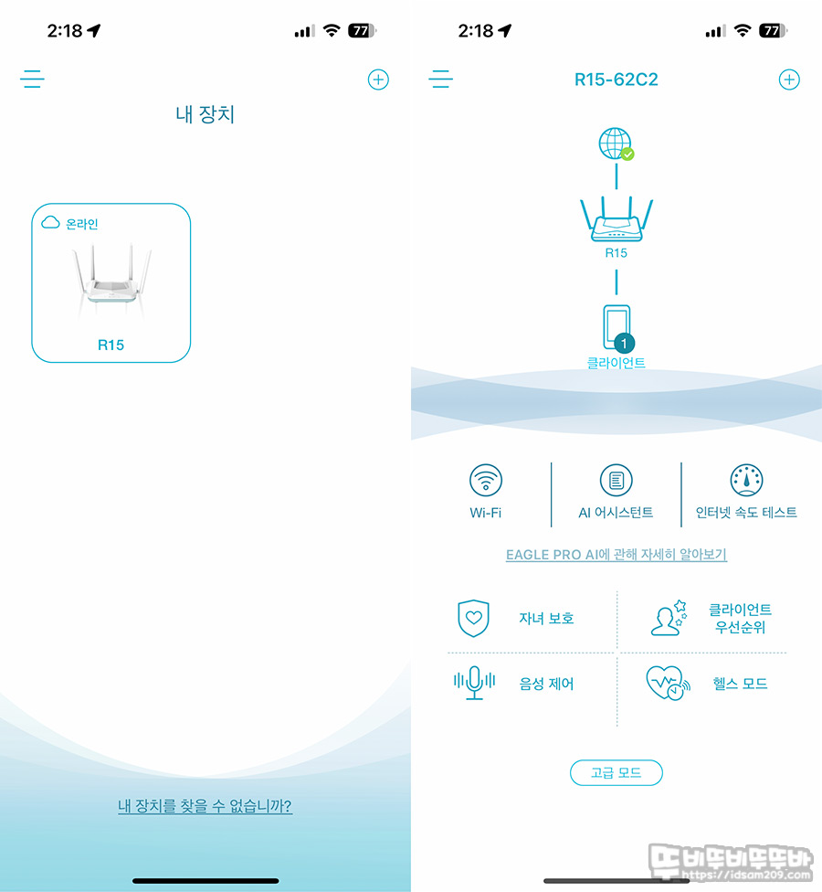 설정이 완료된 후 앱을 실행하면 D-Link R15 Eagle Pro AI AX1500 Wi-Fi 6 유무선공유기 아이콘이 보이며 아이콘을 선택해 주면 직관적인 메뉴로 관리하는 메뉴를 접하게 됩니다.