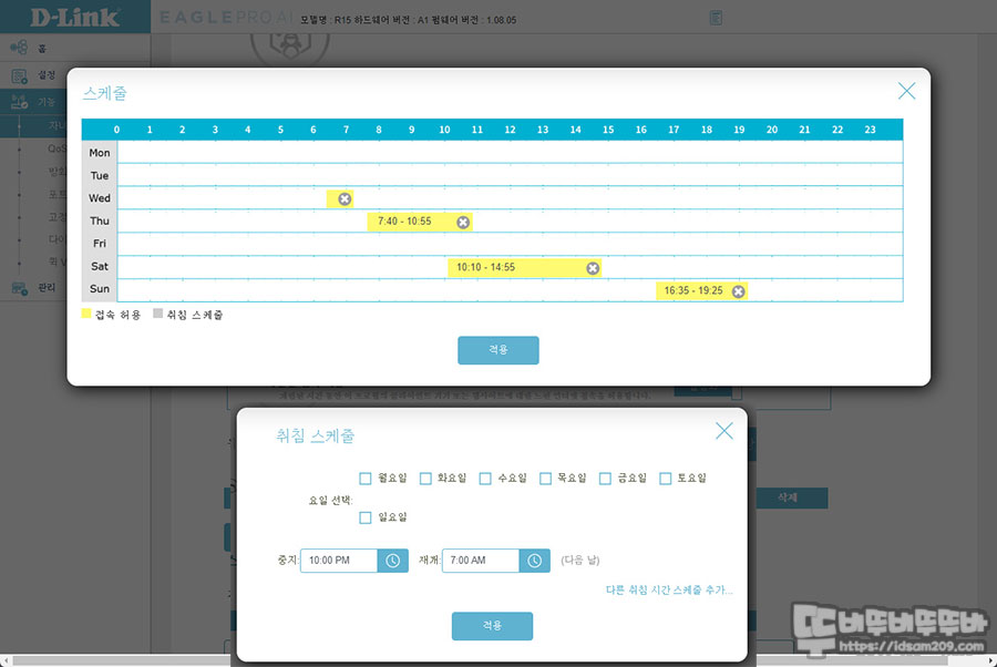 자녀가 있는 부모님들이 유용하게 사용할 수 있는 자녀 보호 기능은 기능 메뉴에 자녀 보호 설정을 하실 수 있는데 날짜 별 스케줄, 취임 스케줄, 웹사이트, 키워드 내용 등을 프로파일로 저장하여 공유기에 연결된 유무선 기기를 선택하여 손쉽게 제어가 가능합니다.