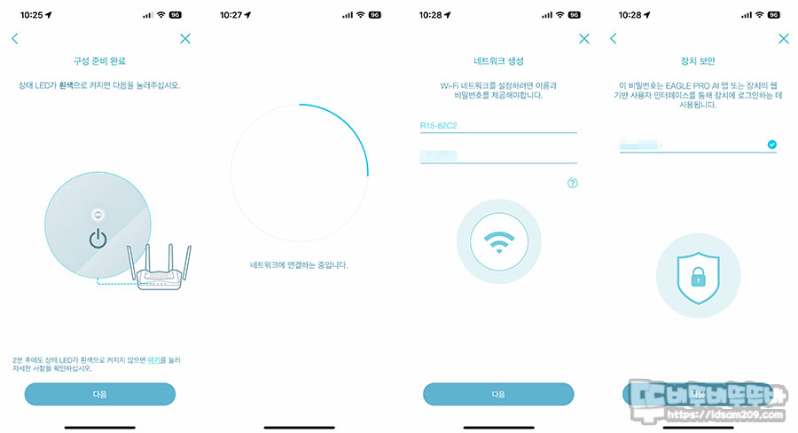 설정 메뉴의 설치 마법사를 선택하는 장치 선택 네트워크 및 Wi-Fi 설정, 공유기 관리자 비밀번호 설정으로 진행하게 되는 이 부분은 전용 앱에서도 동일하게 진행됩니다.