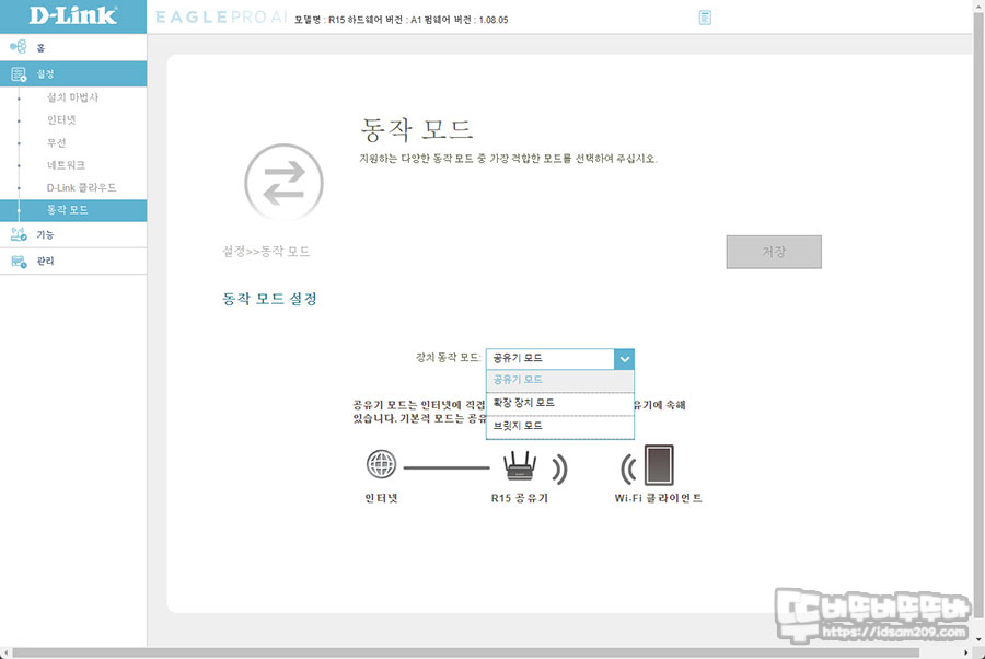 그 밖에 네트워크 정보를 보여주는 네트워크 메뉴 D-Link 클라우드, 공유기 또는 확장(익스텐더), 브리지(WPS) 모드를 선택하는 메뉴를 확인할 수 있네요.