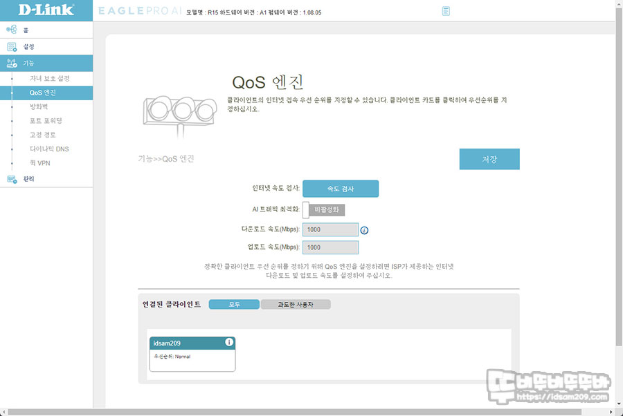 고급 인터넷 공유기에 들어있는 QoS 설정도 지원하고 있어 여러 대의 기기가 동시 접속을 하는 환경에서 트래핑이 증가하더라도 차등 분배를 통해 안정적인 무선연결이 가능하니 중요한 앱을 동시에 사용하는 경우 기기별로 속도를 분배를 하시면 사용하시는데 도움이 되실 겁니다.