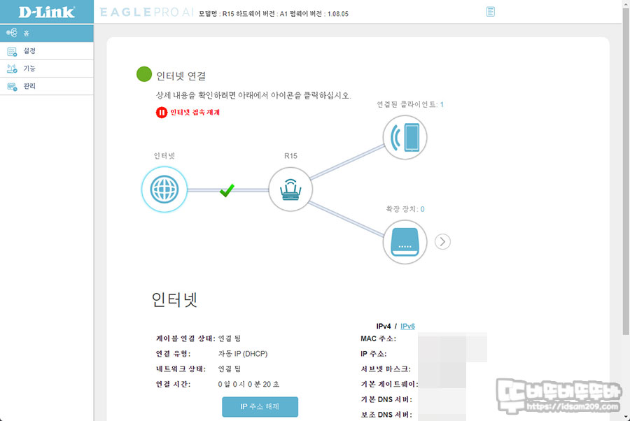 관리자 메뉴 구성은 인터넷 연결 상태를 보여주는 홈, 설정, 기능, 관리 메뉴로 구성되어 있고요.