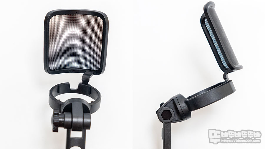 특이한 점은 팝 필터와 스탠드가 일체형으로 디자인되어 있어 번거롭게 사용하는 팝 필터에 신경을 쓰지 않아도 된다는 점이며 스탠드의 마이크 경사각도 조절은 위의 사진과 같이 90도 위치에서 위로 약 35도 위치까지 움직이는 경사 각을 가지고 있습니다.