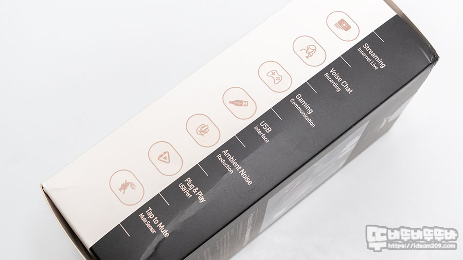 패키지에는 제품의 이미지와 스트리밍, 보이스 레코딩 및 게임 음성 채팅에 사용 가능하다는 내용과 USB 인터페이스 그리고 카디오이드(Cardioid) 패턴 지원 마이크, RGB 라이팅 지원이 강조되고 있습니다.