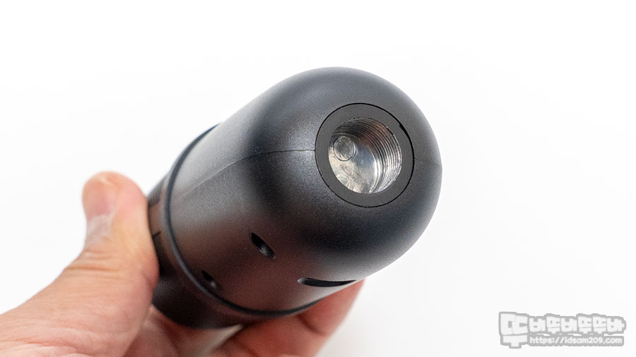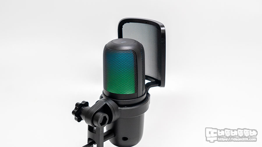 마이크를 살펴보면 RGB 라이팅을 지원하는 제품답게 금속 메 안쪽에 LED 확산을 담당하는 디퓨저가 내장된 것을 확인할 수 있으며 로고가 있는 전면에 작동상태를 나타내는 네모난 LED 인디케이터 모습을 확인할 수 있습니다.