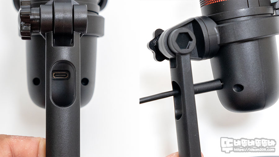 스탠드 뒤쪽에는 USB-C 케이블이 관통할 수 있는 구조로 마이크를 정면으로 놓고 사용하는 구조라 스탠드가 걸림이 있지 않을까 했는데 걱정할 필요가 없었습니다.
