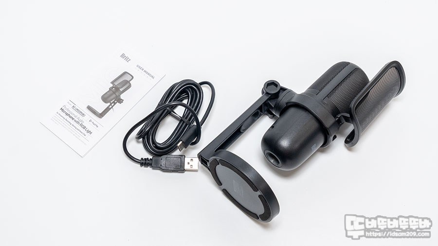 제품은 사용 설명서, 2m USB-C to A 케이블, 마이크 본체 그리고 팝 필터가 일체 된 스탠드로 구성되어 있습니다.