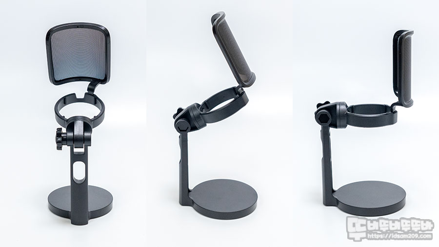 특이한 점은 팝 필터와 스탠드가 일체형으로 디자인되어 있어 번거롭게 사용하는 팝 필터에 신경을 쓰지 않아도 된다는 점이며 스탠드의 마이크 경사각도 조절은 위의 사진과 같이 90도 위치에서 위로 약 35도 위치까지 움직이는 경사 각을 가지고 있습니다.