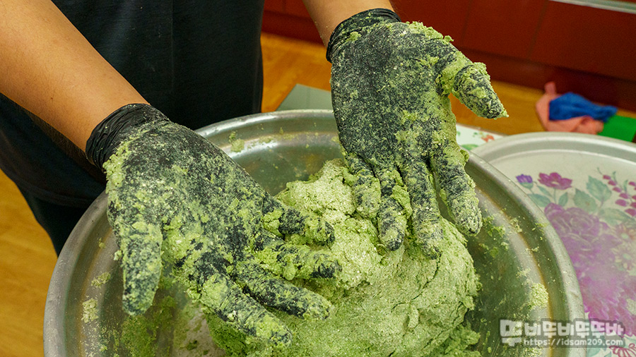 보움보움 니트릴 위생장갑을 착용 후 가루에서 반죽이 되어가면서 살짝 질척해지는 상황이 되면서 혹시 찢어지는 거 아냐? 하는 생각이 들어가는 중 장갑에도 반죽이 들려 붙으며 송편 반죽이 완성되어 가는 마지막까지 생각보다 짱짱하게 유지되어서 만족스러웠습니다.