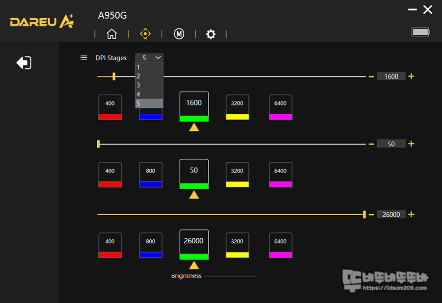 DPI는 최소 50 ~ 2600 DPI까지 사용이 가능하며 DPI 변경은 50단위로 진행됩니다.