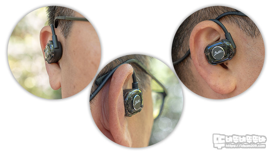 골전도 이어폰은 스피커 유닛의 진동을 정수리 부분에 닿게 하여 간접적으로 듣는 형태지만 BZ-UL20BT 블루투스 이어폰은 귓구멍 앞에서 직접 들려주는 형태라 소리가 더 좋게 들리긴 하는데 인이어 타입과 다르게 귓구멍과 블루투스 이어폰 사이에 공간이 느껴집니다.