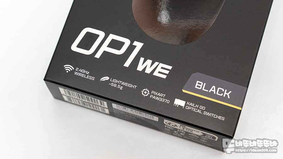 ENDGAMEGEAR OP1we 패키지에서는 제품의 외형과 RF 2.4GHz 무선, 58.6g의 가벼운 무게, 픽셀아트 3370 센서 사용, KAILH GO 광 스위치 사용 정보를 포인트로 강조하고 있습니다.