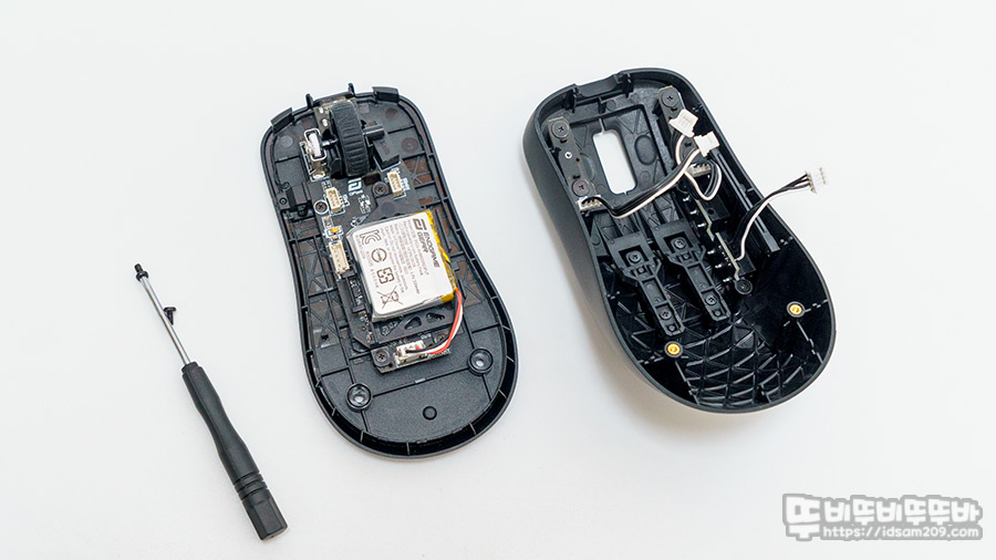 마우스 하우징 분해해 보면 마우스 중앙에 배터리가 위치하고 있어 마우스를 들거나 움직일 때 무게 중심의 밸런스가 잘 잡혀 있네요.