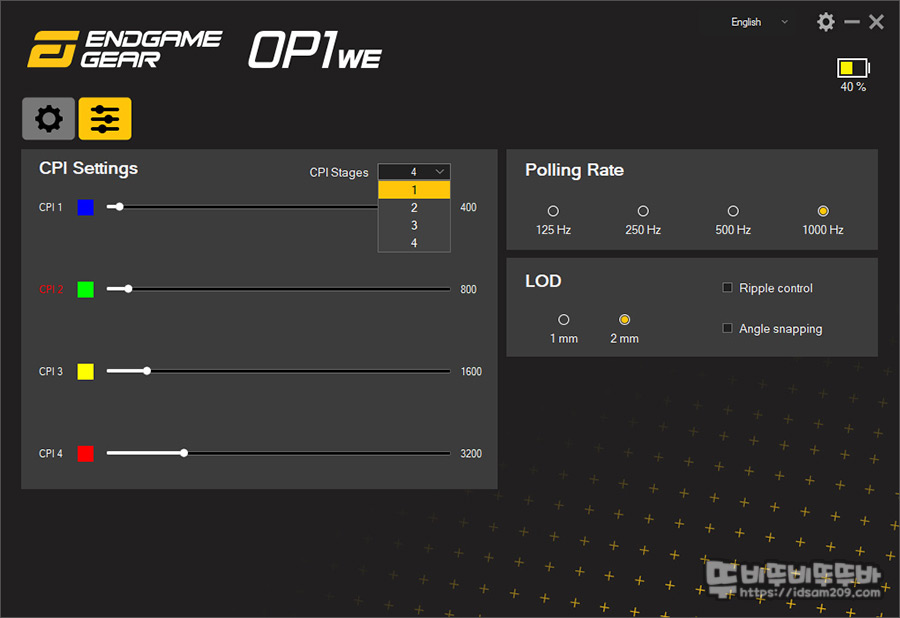 DPI 설정 메뉴에서는 최대 4단계로 사용 가능한 DPI 레벨, USB 폴링 레이트 125 / 250 / 500 /1000 Hz 선택, L.O.D 설정 및 리플 컨트롤, 앵글 스냅핑 기능이 지원되는데요.