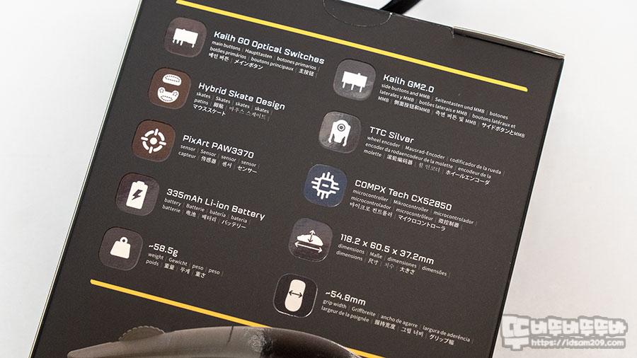 메인 버튼 Kaith Go 광 스위치, 하이브리드 마우스 피트 디자인, 픽셀아트 PAW3370 센서, 335mAh 리튬폴리머 배터리 사용, 58.5g 가벼운 무게, Kailh GM 2.0 스위치 사용, TTC 실버 휠 인코더, CX5850 컨트롤러 칩셋, 118.2 X 60.5 X 37.2mm t사이즈 및 54.8mm 그립 폭 등에 정보를 확인할 수 있네요.