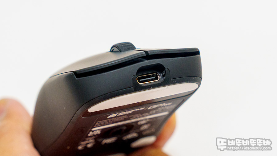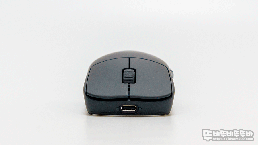 마우스 전면에는 USB-C 단자를 사용하고 있어 유선 마우스 사용 및 충전을 겸하고 있으며 유선으로 사용하는 경우 케이블이 바닥에 쓸리지 않게 대각선으로 솟아오르는 디자인이 적용된 케이블 몰딩이 인상적이네요.