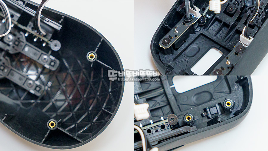 마우스를 분해하면서 놀란 부분은 나사가 고정되는 부분에 인서트 너트가 적용되어 한층 내구성이 강화된 모습으로 자주 교체하더라도 안심하고 분해 결합을 할 수 있다는 점이 정말 좋았습니다.