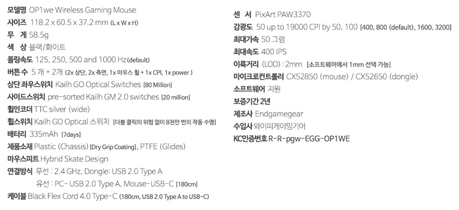 ENDGAMEGEAR OP1we 패키지에서는 제품의 외형과 RF 2.4GHz 무선, 58.6g의 가벼운 무게, 픽셀아트 3370 센서 사용, KAILH GO 광 스위치 사용 정보를 포인트로 강조하고 있습니다.