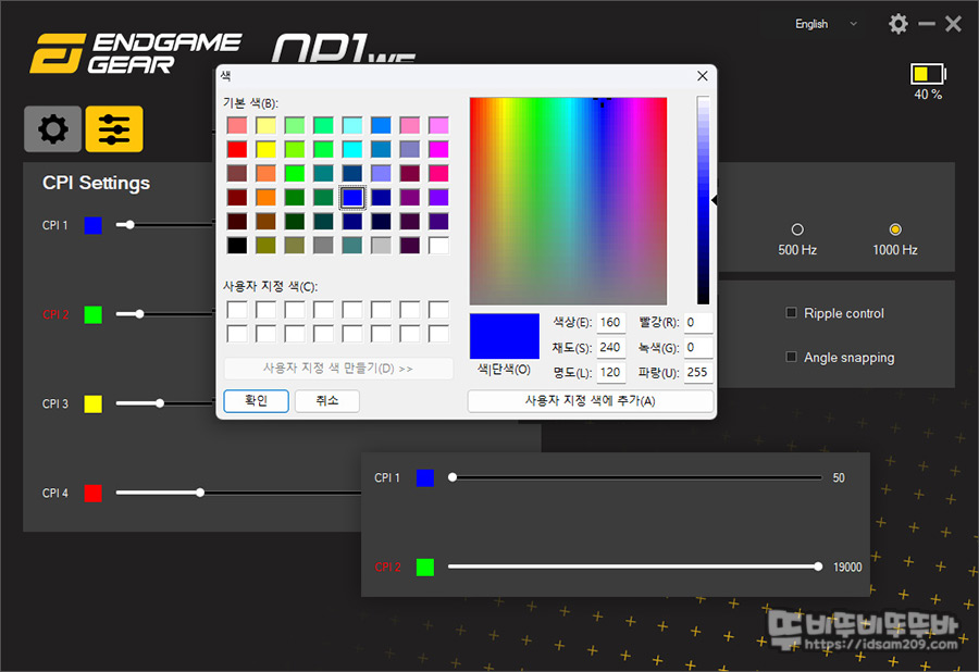 기본적인 DPI 컬러는 마우스 측면을 통해 확인이 가능하며 네모난 컬러 박스를 선택 시 컬러 변경이 가능합니다.