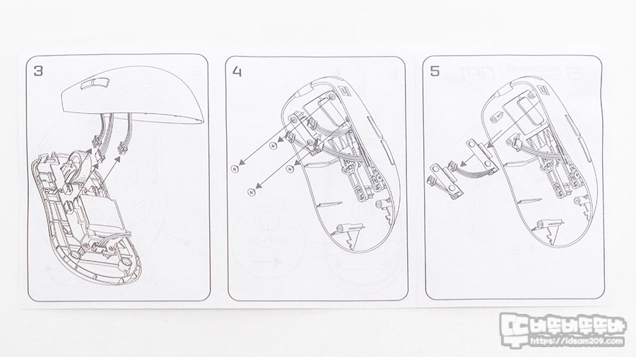 설명서의 내용을 살펴보면 마우스 뒤쪽에 나사를 풀고 하우징을 분리 후 좌우 버튼 그리고 사이드 버튼 연결 커넥터를 분리 후 스위치 기판이 고정된 나사를 풀어 스위치를 교체하고 역순으로 조립하는 과정이 잘 표현되어 있어 쉽게 이해할 수 있게 잘 만들었네요.