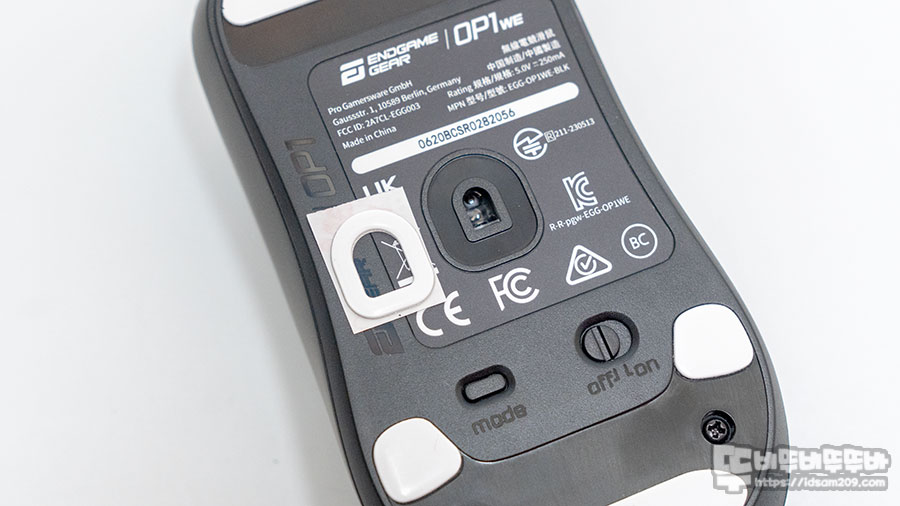 바닥면을 살펴보면 DPI를 선택할 수 있는 Mode 버튼과 전원 On/Off 스위치로 구성되어 있으며 센서 주변에 마우스 피트가 부착되어 있지 않기에 필요에 따라 부착하시면 될 거 같고요.
