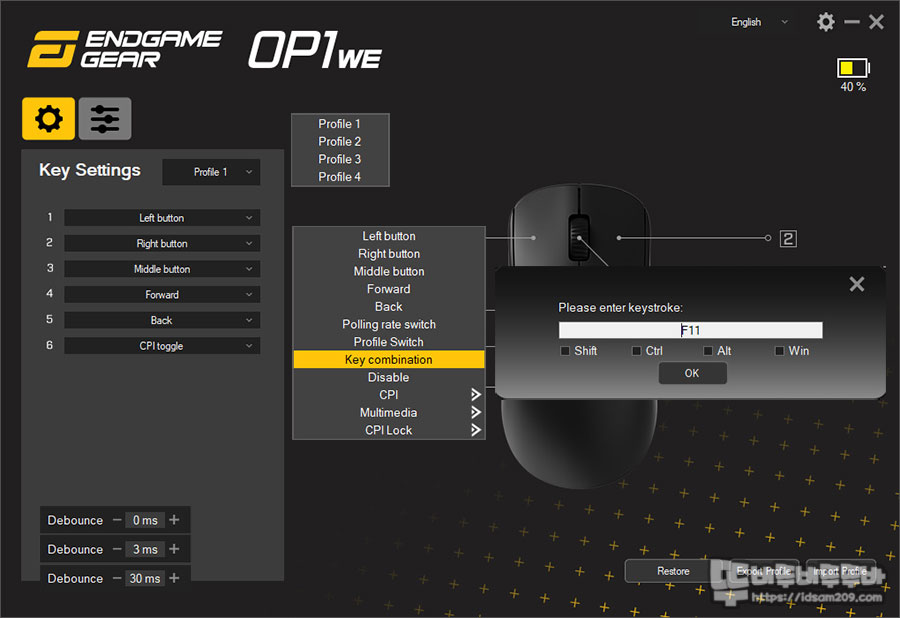 버튼 메뉴에서는 4개의 프로파일 선택, 다양한 버튼 기능 그리고 0~ 30ms 설정이 가능한 디바운스 타임을 지원하며 상황에 따라 키 콤비네이션을 이용한 단축키 또는 멀티미디어 기능과 폴링 레이트, 프로파일 스위칭 기능을 활용하시면 좋습니다.