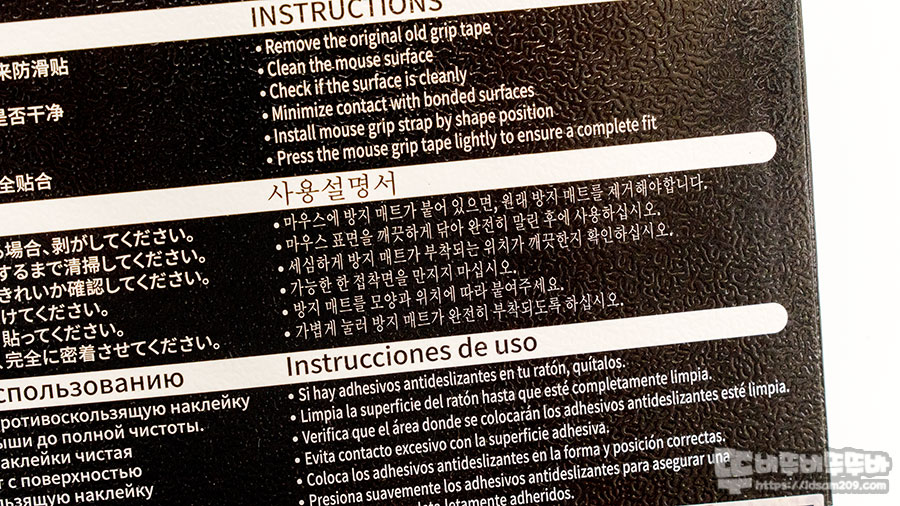 구성품은 GECKO 마우스 그립 테이프와 접착제 제거용 페이퍼(화이트가 많이 보이는 거), 알코올 페이퍼(검은색이 많이 보이는 거)로 구성되어 있습니다.