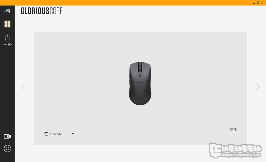 글로리어스 게이밍 기어가 연결되어 있을 때 연결된 제품을 보여주는 대시보드에서는 배터리 잔량을 확인할 수 있으며 연결된 기기를 선택하면 세부 설정 메뉴로 진입하게 됩니다.